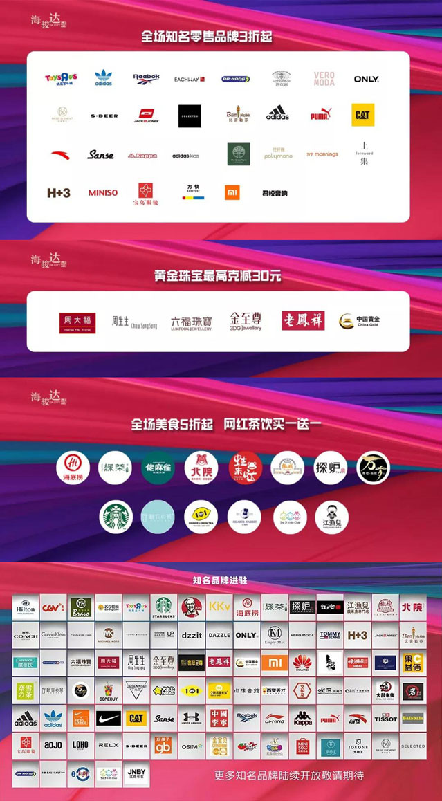 除了各種活動外,海駿達(dá)城在開放當(dāng)天還聯(lián)合各大品牌商家實行多重優(yōu)惠重磅輸出,鉅惠全城。轉(zhuǎn)發(fā)有禮,會員專享積分,零售品牌全場最低3折,餐飲品牌全場最低5折,黃金最高克減30元等。其中,玩具反斗城滿200送100、滿100減50;VERO MODA全場5折起;Adidas originals全場8折;金至尊彩金鉆石滿1000立減300;海底撈送送菜卡;椒戲酸菜魚5折……吃喝玩樂購,應(yīng)有盡有,一應(yīng)俱全,瞬間滿足。