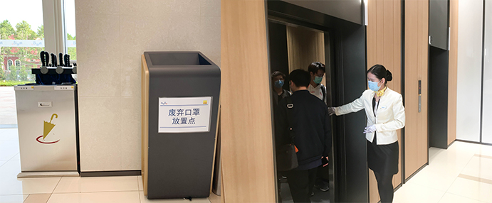 在一樓大堂設(shè)有“廢棄口罩”專用垃圾桶,將廢棄口罩與其他垃圾分類隔離處理,物業(yè)人員定時(shí)消毒