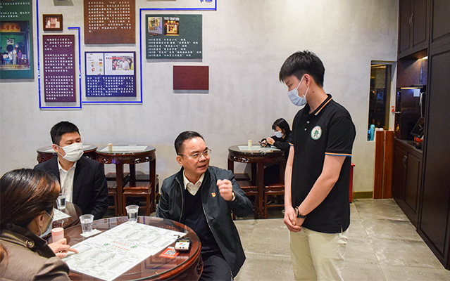 在順德海駿達(dá)城陳總陪同下到達(dá)順德老字號(hào)甜品店仁信老鋪了解商戶復(fù)工情況并帶頭消費(fèi),對(duì)于商家采取的“進(jìn)店登記、凡進(jìn)店須測(cè)體溫、降低餐位密度”等防控措施表示肯定。